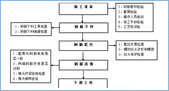 說明:本流程圖反映的是一個合格的鋼筋直螺紋套筒連接施工工藝。如果某道工序經(jīng)自檢不合格,不能進行下道工序施工。